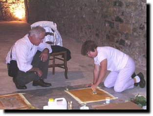 Des éléments (minéraux, végétaux, autres…) pris dans l’environnement proche du lieu où se déroule l’atelier sont collés sur un support enduit d’un mélange colle à farine-ocres, terres, cendres pilées.